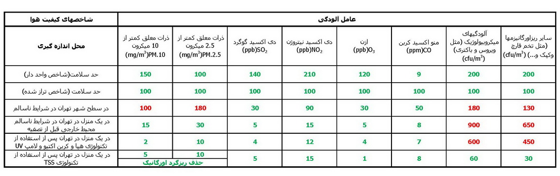 همانطور که در جداول فوق ملاحظه می گردد، دستگاههای تصفیه هوا با تکنولوژی TSSدر محیط خانگی عملا موثرتر از سایر دستگاه های تصفیه هوا با تکنولوژی های دیگر می باشند. این دستگاهها حتی در محیطهایی مانند خانه های شمال کشور که از رطوبت بالایی برخوردارند میتوانند بسیار در از بین بردن آلودگیها موثر واقع شوند. در حالیکه عملکرد سیستمهای فن و فیلتر عملا در چنین محیطهایی بلافاصله مختل شده و روزنه های فیلتر هپا بدلیل رطوبت بالا کاملا مسدود و بلااستفاده میگردند. در محیط هایی مانند شهر اهواز که طوفان شن و توزیع گرد وغبار به حدیست که هوای داخل منزل در سطح بالایی متاثر از محیط خارجی میگردد، بطوریکه حضور آلودگیهای خارجی در داخل به وضوح قابل مشاهده است (مانند نشستن خاک بر روی اثاثیه منزل به دفعات در روز و یا بوی گازهای شیمیایی و پسماندهای گازوئیل و بنزین در داخل منزل) توصیه میگردد از ترکیب تکنولوژیهای TSS، هپا و کربن اکتیو استفاده گردد.