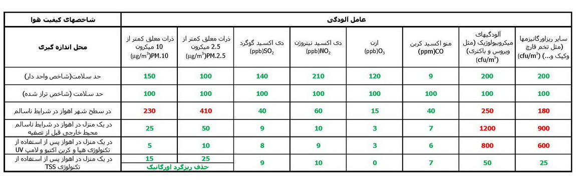 به منظور روشن شدن تفاوت آلودگی محیط خارجی و داخلی، تابلوهای راهنمای آلودگی در آلوده ترین روزهای سال در بعضی از شهرهای شاخص و معادل سازی و مقایسه آن ها با آلودگی در داخل منزل به صورت جداول آماری ارائه شده اند. در جداول ذیل فرض بر آن است که مساحت تحت پوشش دستگاه برای فضای استفاده شده کافی باشد.